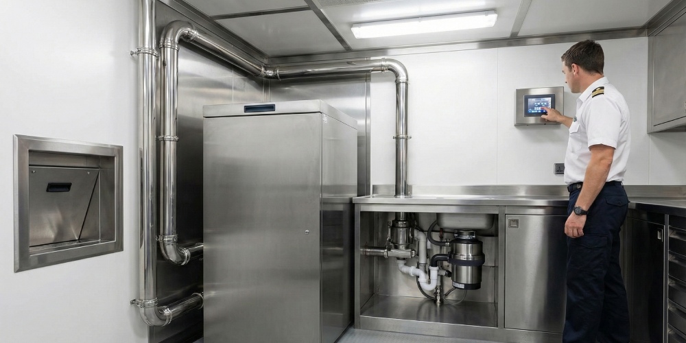 Industrial waste disposers are critical equipment in galley operations. These units, mounted under the sink, turn food scraps (vegetable peels, small bones, etc.) into liquid form in seconds. This process reduces waste volume and prevents bad odors. Disposers meeting UNOKS standards prevent clogging with high-torque motors and stainless steel blades. Ground waste can be sent to the grey water tank or directly to the sea (within legal limits).